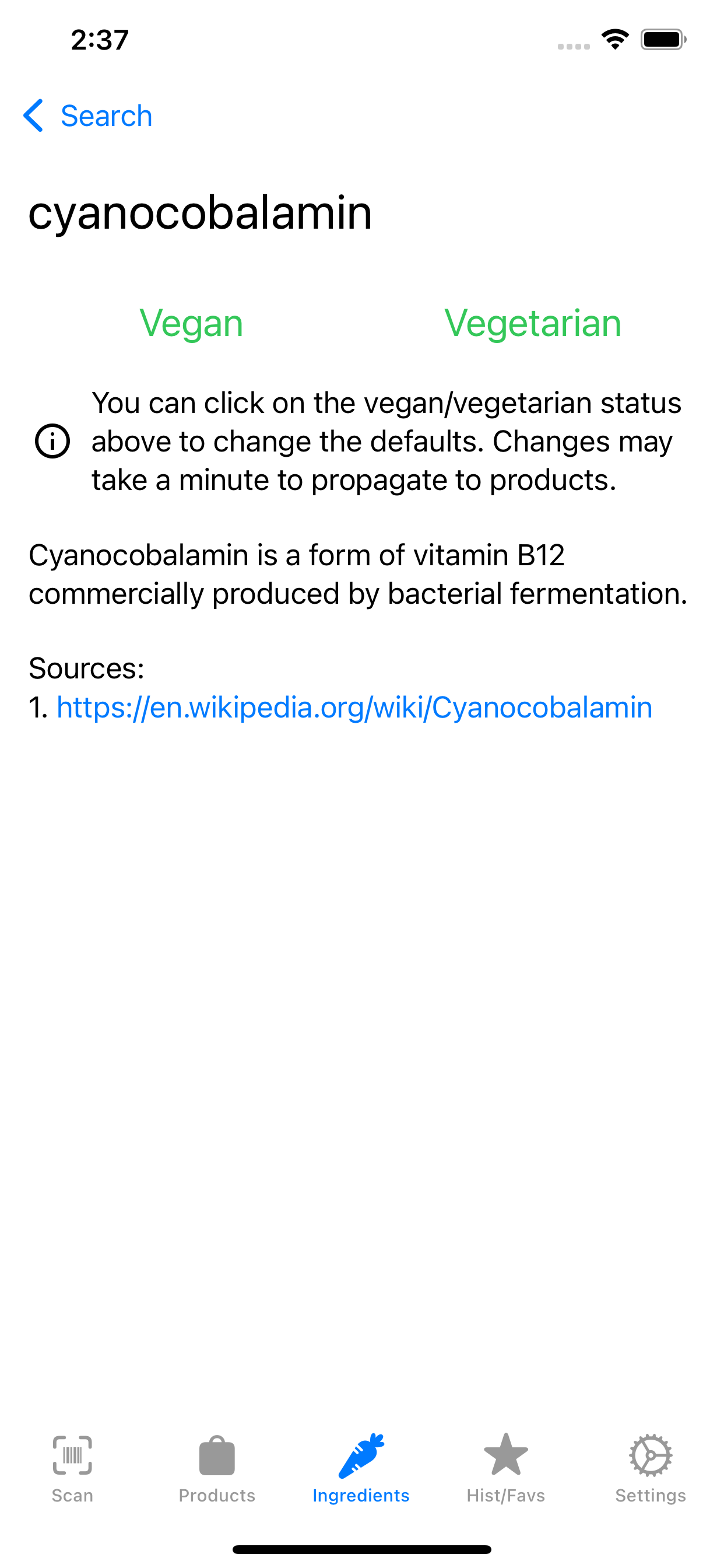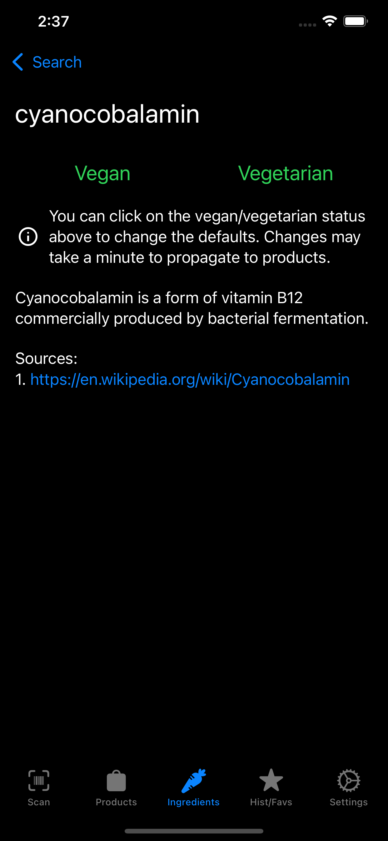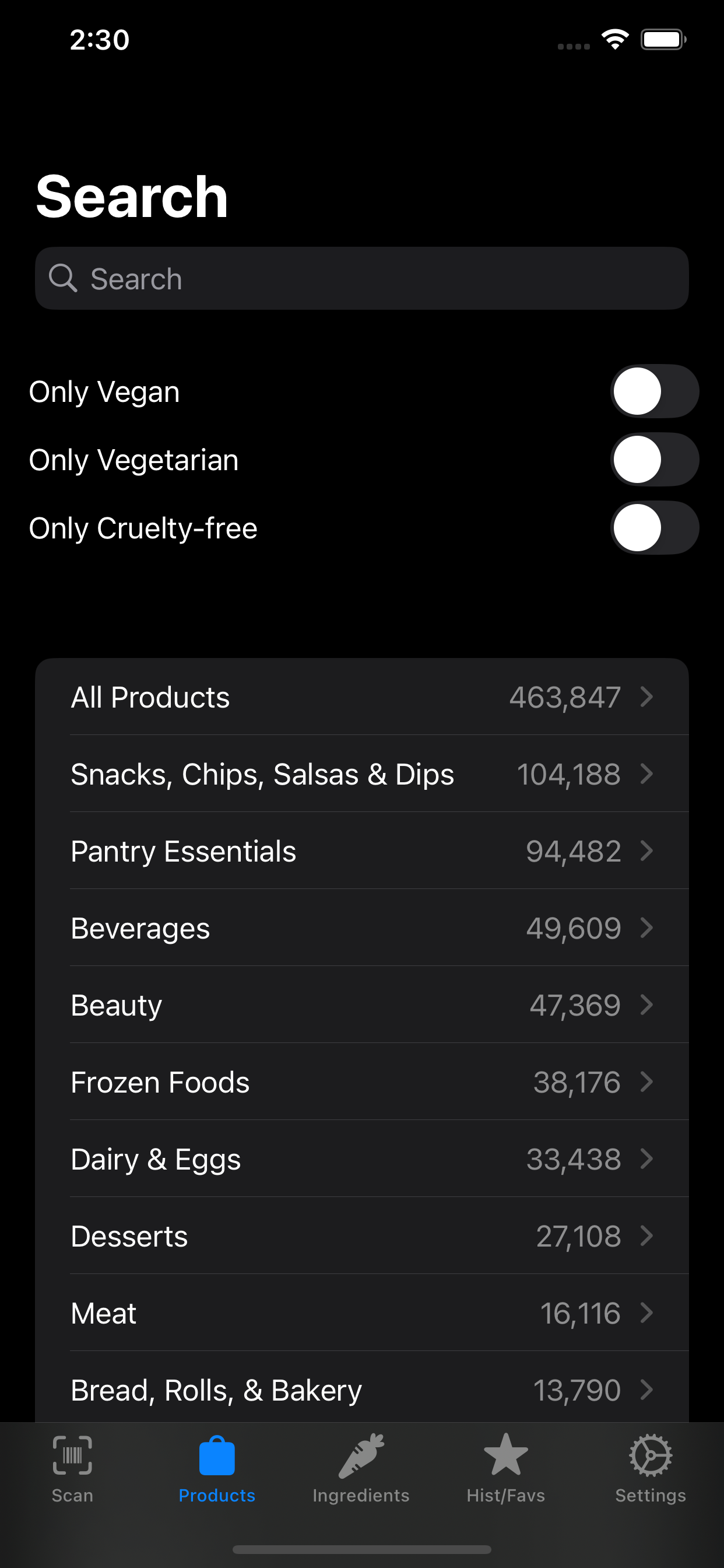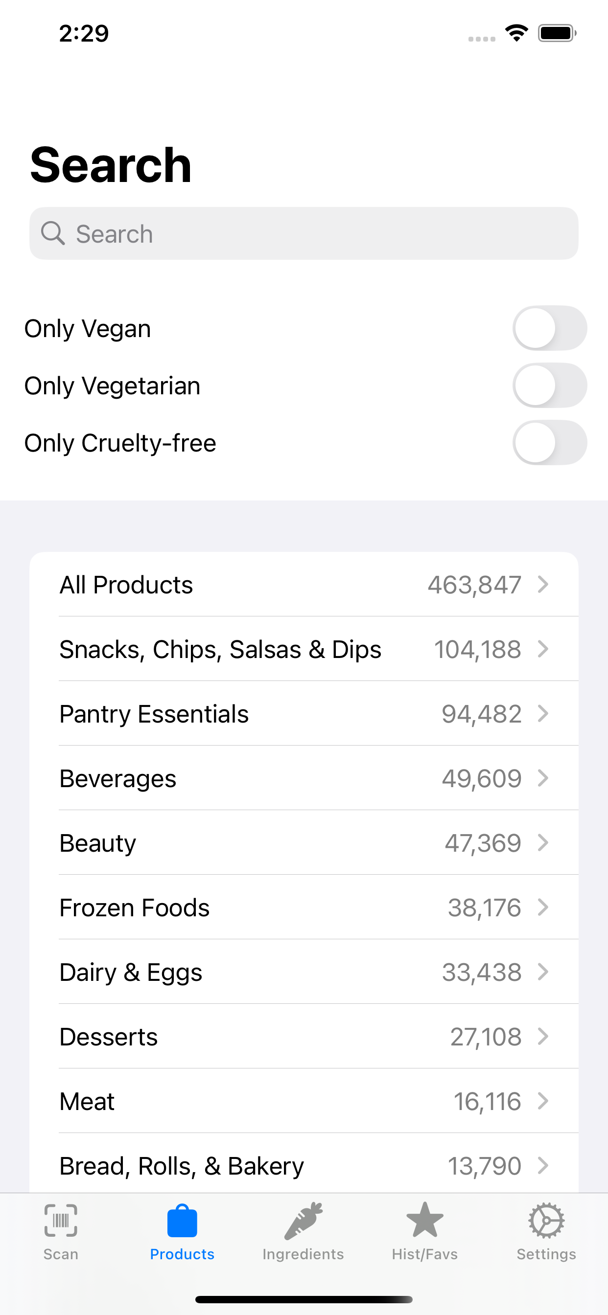 Vegandex is an Android and iOS app that allows you to scan barcodes and search products to determine if they are vegan.